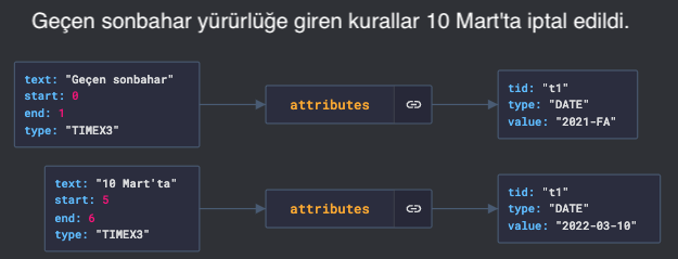We offer a wide coverage temporal expression identifier and normalizer, supporting TIMEX3 standard. Both absolute (such as 19 Haziran) and relative (such as geçen sonbahar ) experssions are supported.
